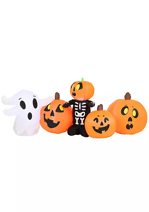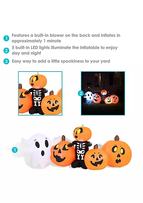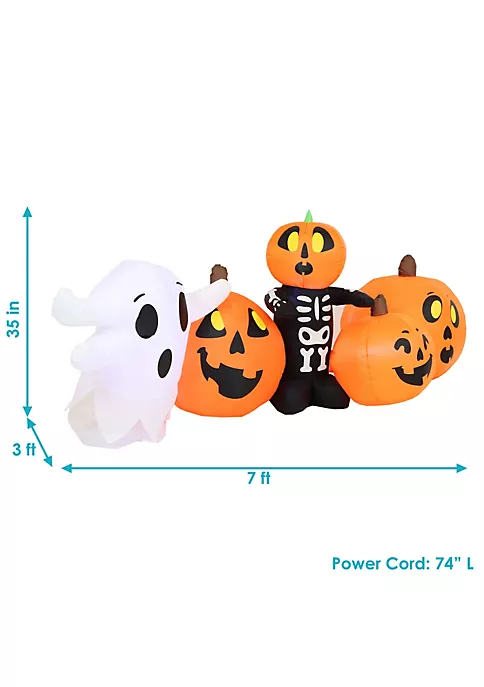 - LARGE OUTDOOR HALLOWEEN INFLATABLE: This outdoor decorative inflatable is 7′ W x 3′ D x 35″ H and weighs 2.8 lbs. This delightful scene of pumpkins, ghosts and skeletons merrily gathered together will be a great addition to your Halloween outdoor decor.
