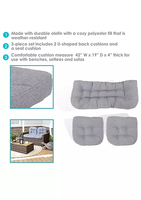 - OVERALL DIMENSIONS: Back cushions (2 total): 19 inches wide x 18 inches tall x 4 inches thick; Weighs 2 lbs per cushion; Seat cushion: 42 inches wide x 19 inches deep x 4 inches thick; Weighs 4.8 lbs; This wicker settee cushion set is designed for use with outdoor benches and loveseats