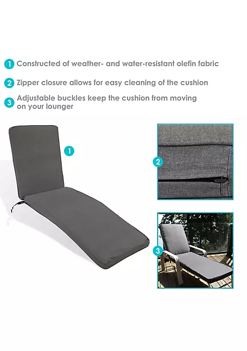 - PERFECT SIZE FOR CHAISE LOUNGE: Cushion is 72 inches long x 21 inches wide x 3 inches thick; Weighs 5.8 pounds; Seat is 43 inches long x 21 inches wide x 3 inches thick; Back is 28 inches long x 21 inches wide x 3 inches thick; Cushion is easy to install on chair with the attached adjustable buckles, to ensure that it stays put on a variety of chairs; Lay back and relax in the backyard, on the lawn or by the pool on top of this cozy cushion
