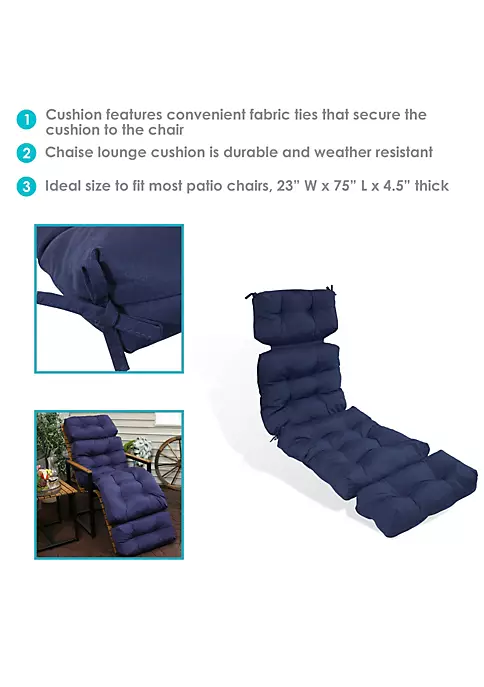 - PERFECT SIZE: The patio chaise lounge cushion fits excellently on your outdoor lounge chair allowing you to achieve ultimate comfort. The overall dimensions of the patio lounge pad are 23 inches wide x 75 inches long x 4.5 inches thick; Weighs 10.4 lbs; Ties: 8.5 inches long (4 total)