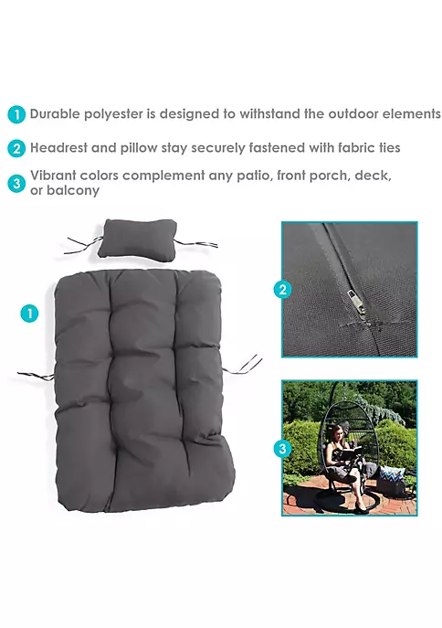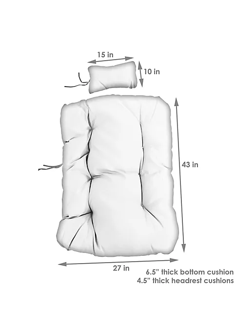 - PLUSH, COMFORTABLE CUSHIONS: Cushion: 27 inches wide x 43 inches deep x 6.5 inches thick; Weighs 2.5 lbs; Headrest: 15 inches wide x 10 inches tall x 4.5 inches thick; Weighs 0.8 lbs; Add these soft, tufted cushions to your hanging egg chair and create a cozy place to relax