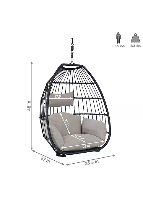 - CLASSIC EGG CHAIR: Chair is 35.5 inches wide x 29 inches deep x 48 inches tall; Weighs 15.8 pounds; Overall chair dimensions (collapsed) are 52 inches long x 35.5 inches wide x 6.75 inches deep; Seat is 20.75 inches wide x 19.5 inches deep x 0.75 inches thick; 265-pound weight capacity; 6-inch thick back cushion; 7-inch thick seat cushion; 6-inch thick arm cushion