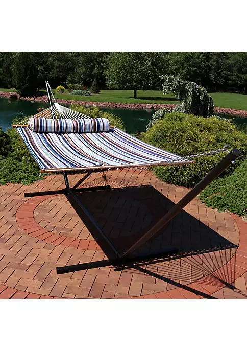 - FITS TWO PEOPLE: Large freestanding hammock measures 130 inches long x 55 inches wide; Extends to 152 inches long with chains and S-hooks; Hammock bed size: 74 x 55 inches; Hammock pillow: 40 x 10 x 6 inches; Weighs 11 pounds