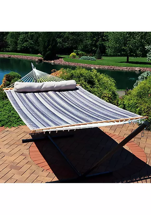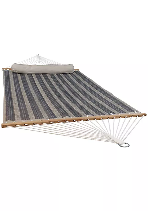 - SPACE-SAVING SIZE: This quilted double hammock is 130 inches long and 55 inches wide from loop to loop. The bed size is 74 inches long by 55 inches wide. It weighs 11 pounds and has a weight capacity of 450 pounds.