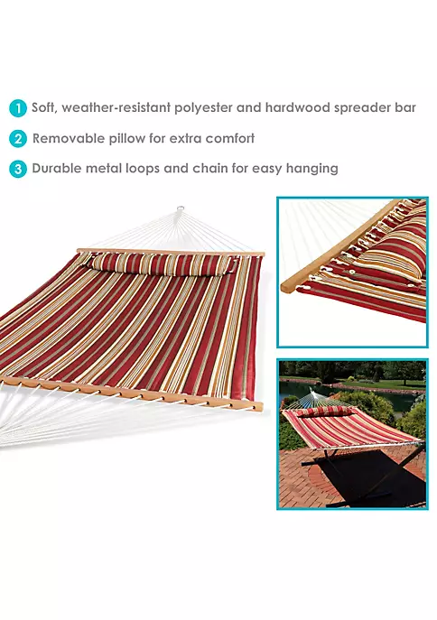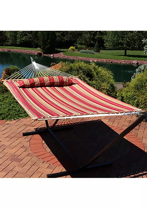 - SPACE-SAVING SIZE: This quilted double hammock is 130 inches long and 55 inches wide from loop to loop. The bed size is 74 inches long by 55 inches wide. It weighs 11 pounds and has a weight capacity of 450 pounds.