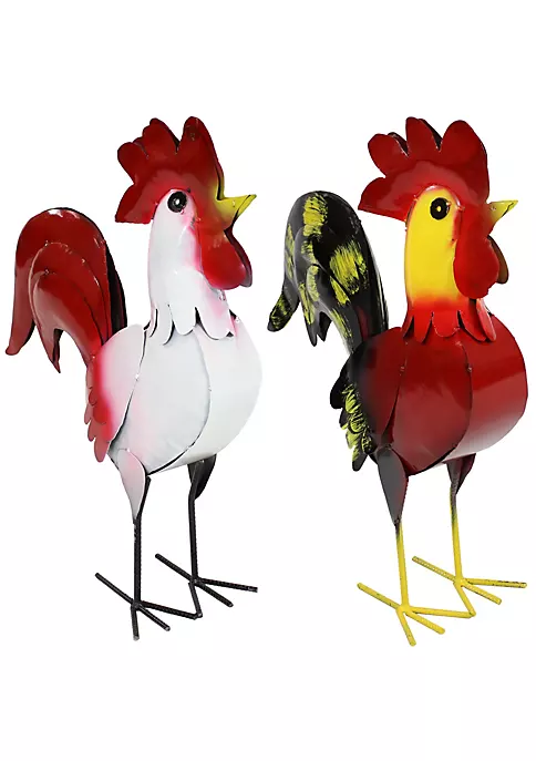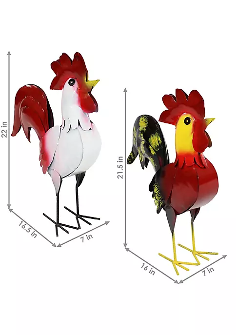 - FARMHOUSE GARDEN ACCENTS: This set includes 2 small rooster statues. Lewis, the red rooster, measures 16″ W x 7″ D x 21.5″ H and weighs 3 lbs while Cluck, the white rooster, measures 16.5″ W x 7″ D x 22″ H and weighs 3 lbs.