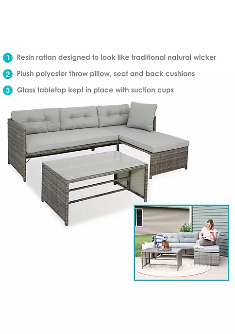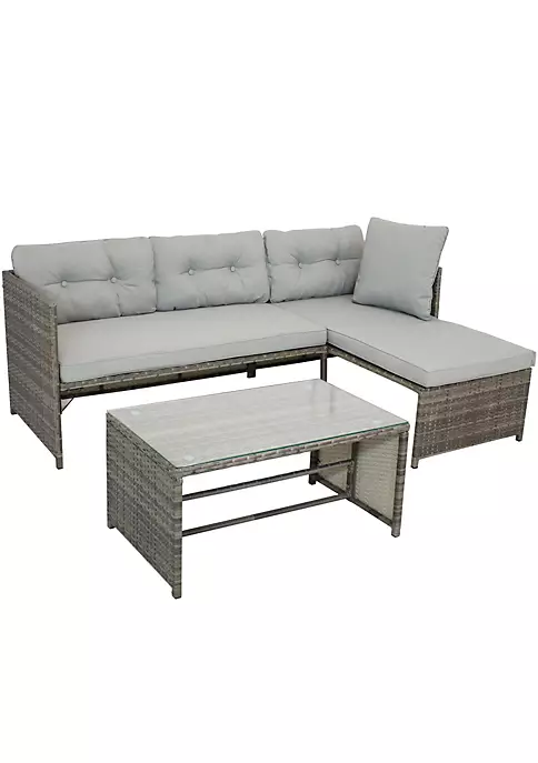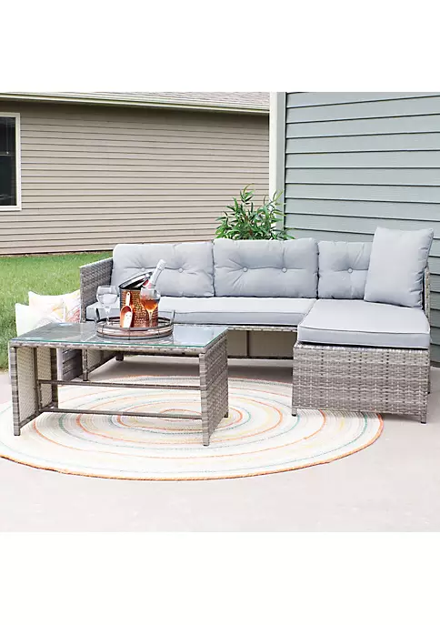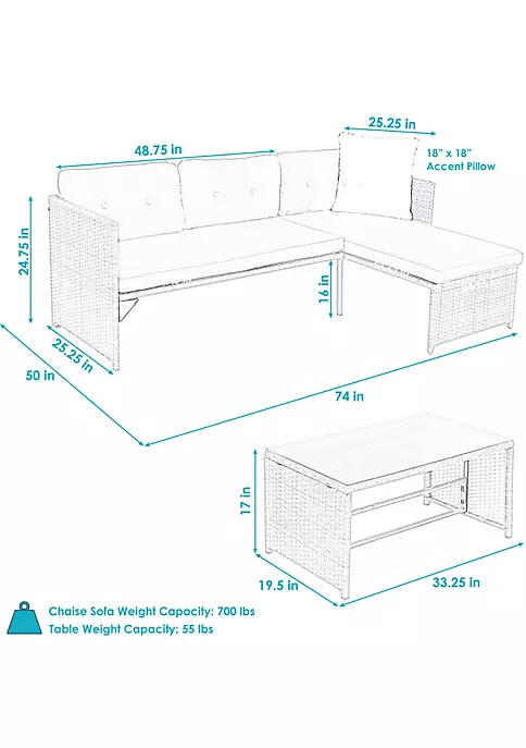 - GREAT ON THE PATIO: Makes a welcome addition to other outdoor living spaces, such as a balcony, garden, porch, gazebo, lawn and other areas outside the home; Sectional: 74″ W x 50″ D x 24.75″ H; Weighs 51.6 lbs; Weight capacity: 700 lbs; Coffee table: 33.25″ W x 19.5″ D x 17″ H; Weighs 20.6 lbs; Weight capacity: 55 lbs
