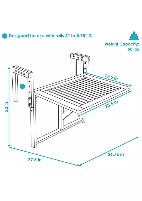 - FITS OVER A BALCONY RAILING: This unique balcony hanging table measures 26.75″ W x 27.75″ D when the tabletop is extended (9.5″ D when the tabletop is lowered) x 22″ H and weighs 11.4 lbs. The tabletop measures 23.5″ W x 17.5″ D x 0.75″ thick. This table is designed for use with railings that are 4″ to 8.75″ D and has four easy-to-adjust height settings. It has a weight capacity of 50 lbs.