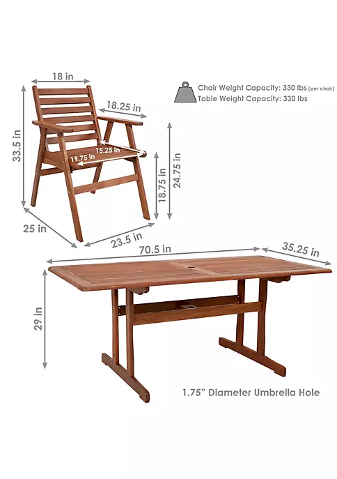 - OVERALL TABLE DIMENSIONS: 70.5 inches wide x 35.25 inches deep x 29 inches tall; tabletop thickness: 0.75 inch; Umbrella hole: 1.75-inch diameter; Weighs 66.8 pounds; Weight capacity: 330 lbs