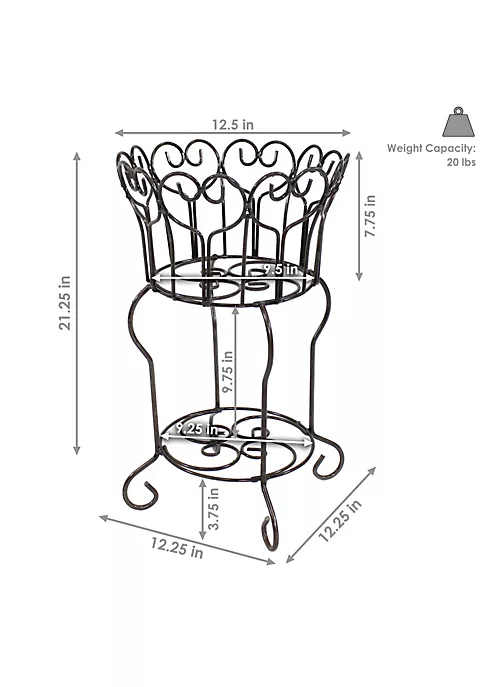 - ELEGANT STANDING PLANT STAND: This lovely plant stand measures 12.25″ W x 12.25″ D x 21.25″ H. The lower shelf has a diameter of 9.25″ and has a height of 3.75″ off the ground. The planter basket has a 9.5″ diameter on the bottom and a 12.5″ diameter at the top, and it measures 7.75″ H. It has a weight capacity of 20 lbs and weighs 5.6 lbs.
