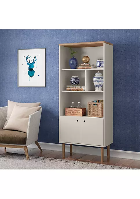 - PLENTY OF STORAGE SPACE: The bookshelf measures 26.75″ W x 14.25″ D x 63.25″ H overall and weighs 64 lbs. The top shelf measures 25.5″ W x 12.5″ D x 13.25″ H, the middle left shelf measures 14.25″ W x 12.5″ D x 11.5″ H, the middle right shelf measures 10″ W x 12.5″ D x 11.5″ H, and the bottom shelf measures 25.5″ W x 13″ D x 13.5″ H. Each shelf can support up to 10 lbs. The cabinet is 25.5″ W x 13.75″ D x 14″ H with two 12.5″ W x 14.25″ H x 0.75″ thick doors. The legs are 1.25″ diameter x 8″ H.