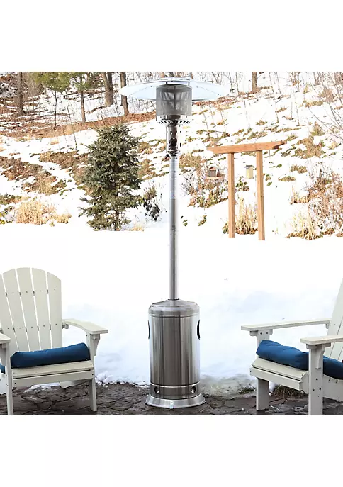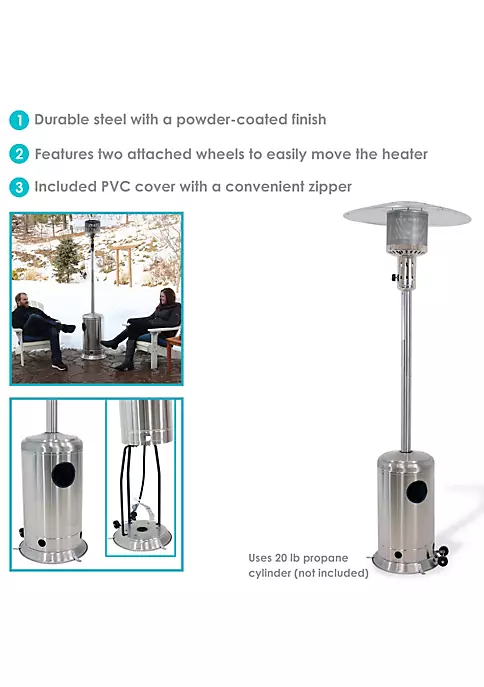 Keep warm while spending time on the patio when it’s cold outside with this outdoor patio heater featuring a table for convenience, wheels for easy maneuvering, and a cover to keep this patio heater lasting for years to come. Made from dependable steel, this outdoor patio propane heater features a stylish, powder-coated finish and a convenient table that can be used for drinks, snacks, and more to have on hand easily! This outdoor heater with an included cover produces 47,000 BTUs and features wheels attached to the base so the heater can be easily moved around the patio or backyard area. This propane heater also includes a durable PVC cover to protect your outdoor heater from the elements when not in use. Place this outdoor patio heater on the patio, at the campsite, on the front porch, or in any other area in need of a warm feature so you can enjoy conversations with friends year-round.