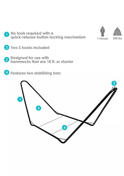 - FITS HAMMOCKS UP TO 10 FEET: 118 inches long x 28.5 inches wide x 40 inches tall, weighs 19 pounds; Weight capacity 330 pounds; Fits hammocks up to 10 feet long