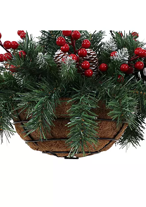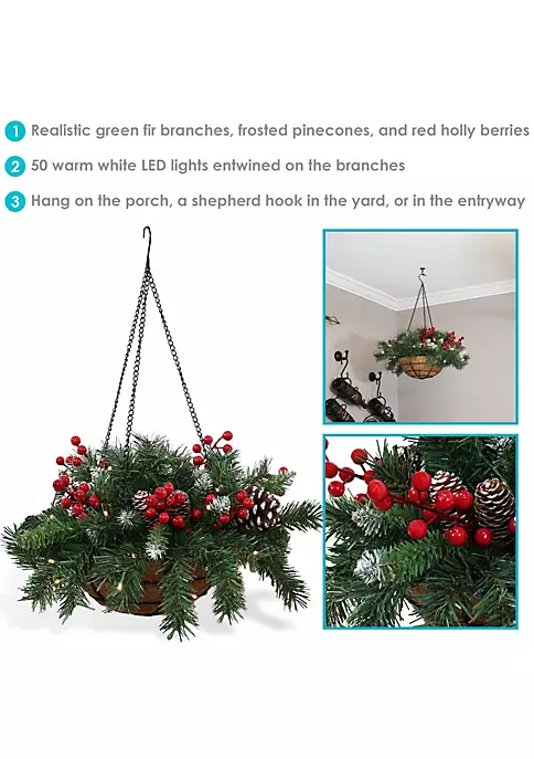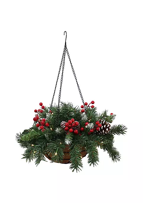 - PRE-LIT HANGING PINE BASKET: This hanging Christmas basket with lights measures 20″ in diameter x 10″ H excluding the hanging chain (or 24″ H including the hanging chain) and weighs 2.6 lbs. The hook is 2.5″ L and the chain is 16″ L. The battery box measures 2″ W x 3″ D x 1″ H.