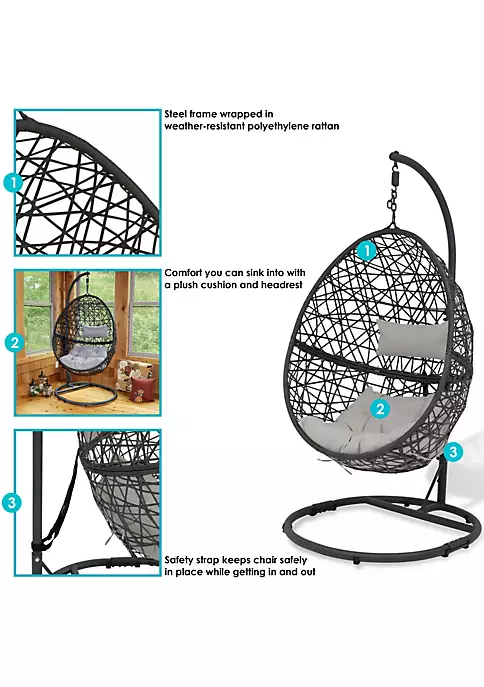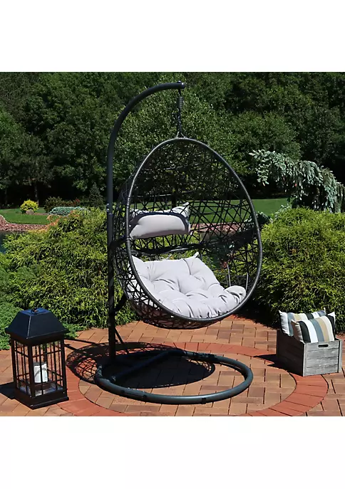- CLASSIC EGG DESIGN AND COMFORTABLE SIZE: 38 inches wide x 25 inches deep x 47.5 inches tall; weighs 20 pounds; Seat cushion: 28 inches wide x 27 inches deep x 4 inches thick; Stand dimensions: 38 inches wide x 42 inches deep x 76 inches tall; Weighs 33 pounds; Weight capacity: 265 pounds