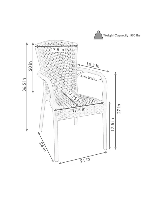 - COMFORTABLE SIZE: 21 inches wide x 26 inches deep x 36.5 inches tall; 9.2 lbs per chair; Weight capacity: 550 lbs; Seat: 17.5 inches wide x 17.75 inches deep x 17.5 inches tall; Back: 17.5 inches wide x 20 inches tall; Arms: 1 inch wide x 15.5 inches deep x 27 inches tall