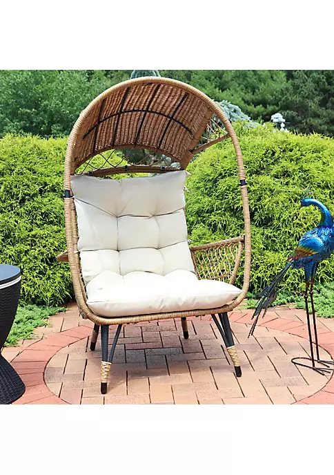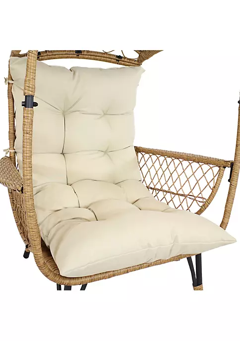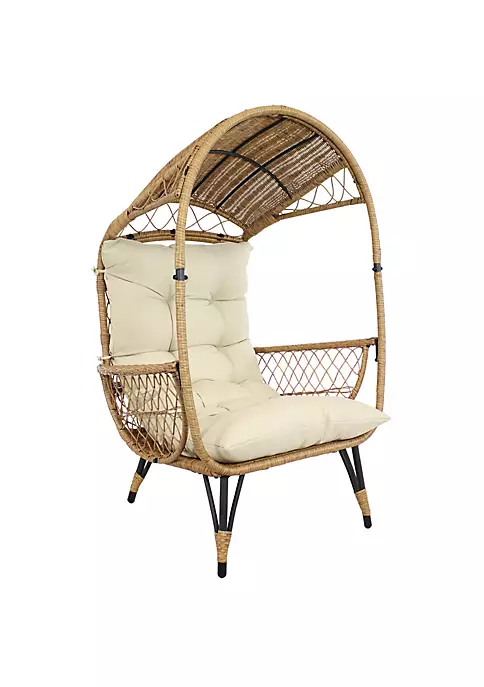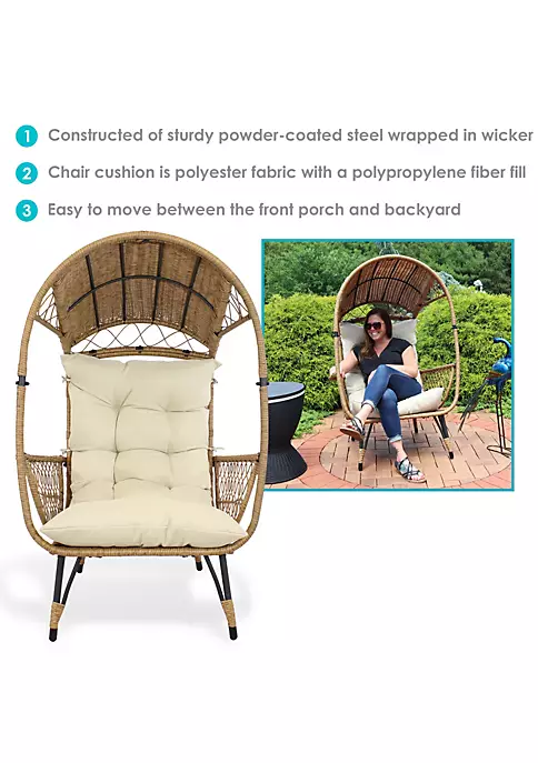 - OVERALL DIMENSIONS: This patio egg chair measures 36โ W x 26โ D x 56.5โ H and weighs 38 lbs. It has a weight capacity of 250 lbs. The arms measure 3.5โ W x 26โ D x 23โ H. The seat measures 27.25โ W x 22โ D x 18โ H. The back measures 27โ W x 25โ H. The legs are 13โ H. The cushion measures 27.25โ W x 47โ H x 6โ thick, weighs 5.2 lbs and features four 7โ long fabric ties.