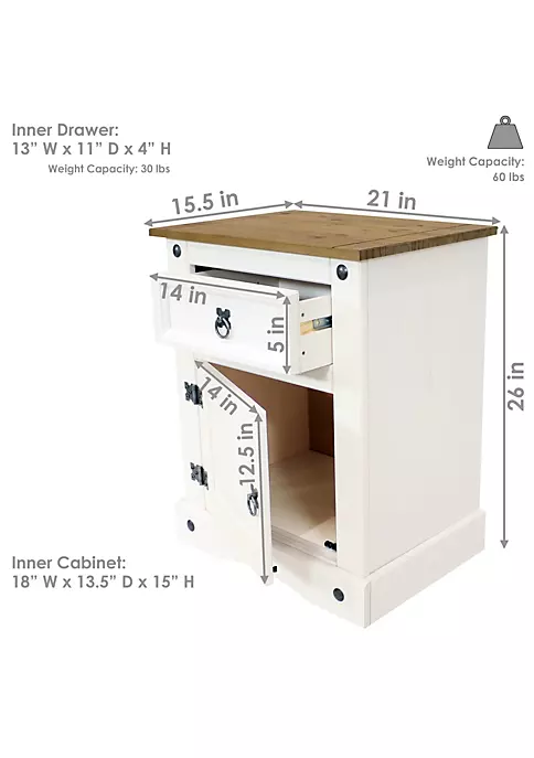 - PLACE NEXT TO A BED, CHAIR OR SOFA: This side table measures 21″ W x 15.5″ D x 26″ H and weighs 24 lbs. The tabletop is 0.5″ thick and the table has an overall weight capacity of 60 lbs. The drawer front measures 14″ W x 5″ H. The drawer interior measures 13″ W x 11″ D x 4″ H and has a weight capacity of 30 lbs. The inner cabinet measures 18″ W x 13.5″ D x 15″ H and has a door that measures 14″ W x 12.5″ H x 0.5″ thick.