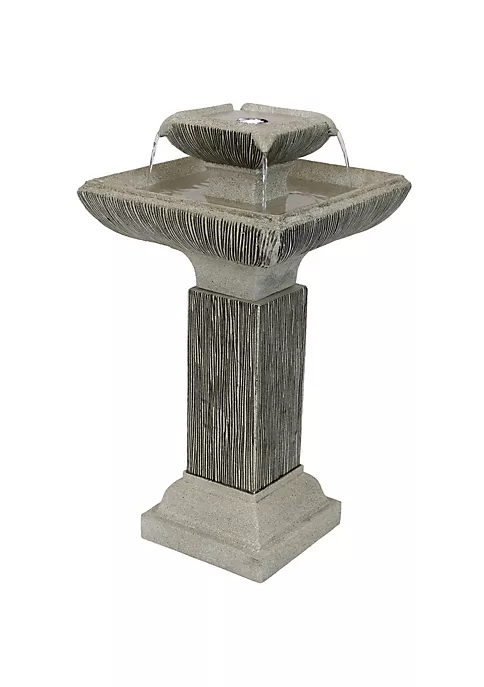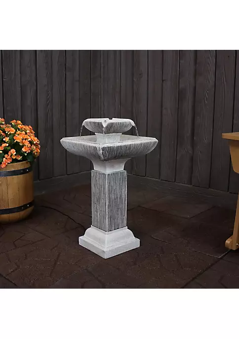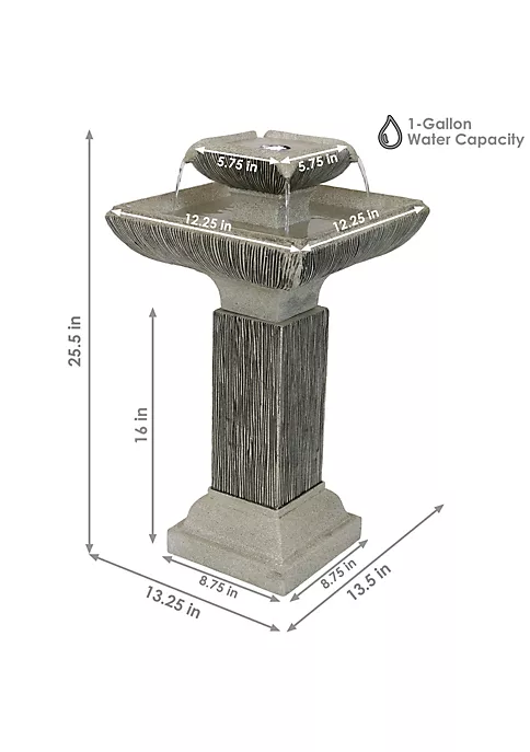 - CLASSIC GARDEN DECOR: 13.25 inches wide x 13.5 inches deep x 25.5 inches tall; Pedestal: 8.75 inches square x 16 inches tall; Lower tier: 12.25 inches square x 2.75 inches deep; Upper tier: 5.75 inches square x 1.25 inches deep; Weighs 19 pounds; Holds 1 gallon of water
