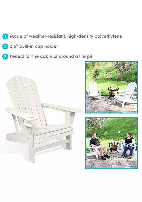 Enjoy a day at the lake or an evening around the fire in this set of comfortable Adirondack chairs. These heavy-duty fire pit chairs are made from durable HDPE to withstand most weather conditions. Designed for lounging, this Adirondack chair set is the perfect addition to your deck, patio, yard, around the fire pit, or at the beach. The traditional design is sure to complement any decor style. Plus, the built-in cup holder keeps drinks conveniently at your side.