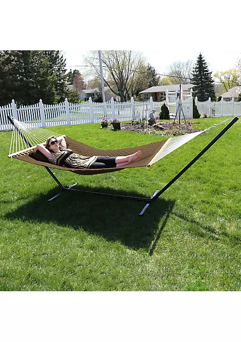 A quilted hammock is great for any outdoor space, patio, deck, or yard. The quilted design features a pattern created by the stitching on the soft solid colored polyester fabric. When combined with the included pillow, the hammock creates a comforting oasis that will gently sway when relaxing with a novel, a drink, or to fall asleep.