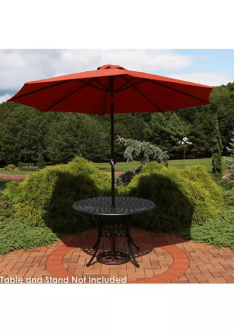 - Outdoor fade resistant patio umbrella|Features spun-poly fabric|95% UV-resistant|Black powder-coated aluminum ribs and speckled bronze powder-coated aluminum pole|Stainless steel fittings|Includes 1 patio umbrella|Base not included|Fits 1.5″ diameter base openings|Wind/heat vent|Push-button tilt and crank|Suitable for 42″ or 54″ outdoor dining tables with 4-6 chairs|Dimensions: 1.5″ diameter pole x 92.5″ H x 103″ diameter umbrella; 11 lbs
