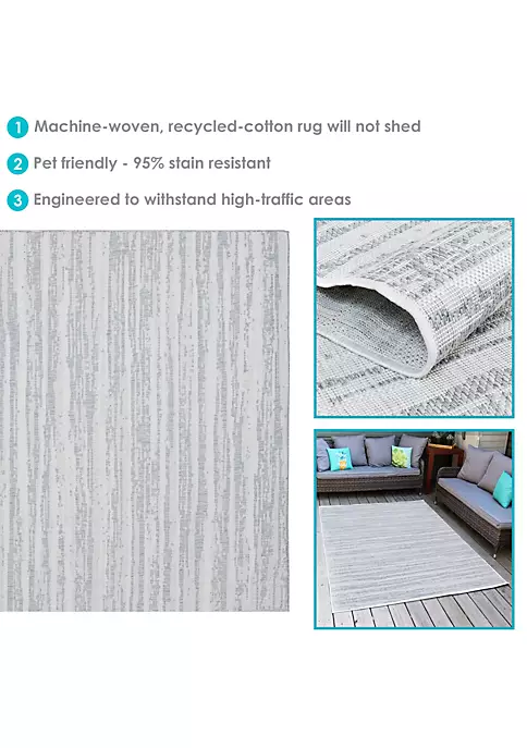 Give your indoor or outdoor space a foundation to build on with this large rectangle area rug by Sunnydaze Decor. The Artistic Storms series is a modern pattern rug with silvery gray abstract lines. The area rug features a polypropylene yarn construction dyed using a UV stabilizer solution for resistance to fading. The rug is also 95% stain resistant. Place the large area rug in any indoor or outdoor space including the porch, patio, deck, campsite, kitchen, living room, entry or dining room!