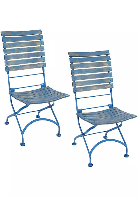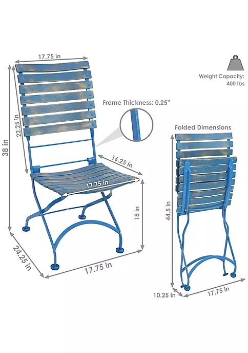 This French cafe style folding bistro style side chair seating set is designed to be the perfect small spare, dining, or conversation seating option indoors or outdoors for many seasons to come! They are easy to utilize while camping, on the patio, lawn or in the garden as well as inside the house for spare seating in the living room or around the dining table for family meals, games, gatherings and more! Designed to last, each chair features a high-quality 7mm thick steel frame and blue-painted chestnut slatted wood seat and back and plastic foot cover glides. The 400-pound capacity ensures extra stability and strength. There’s a myriad of uses for these chairs and they fold down for slim-profile storage in the shed, garage, closet, cabinet or behind/under larger furniture pieces such as beds and sofas.