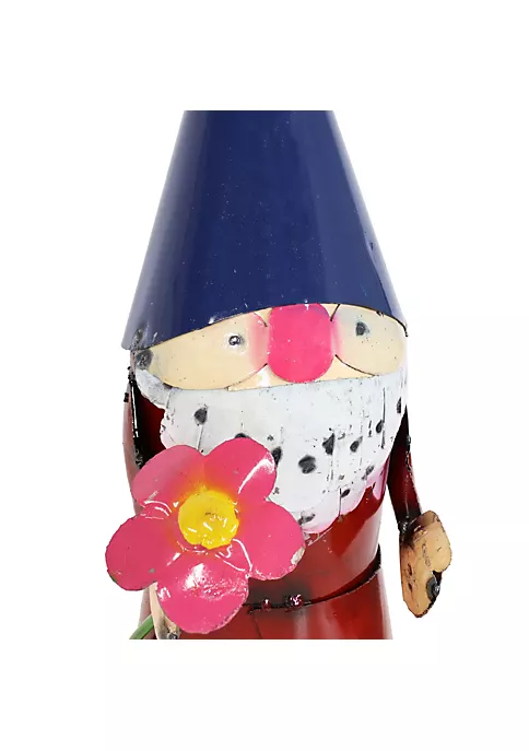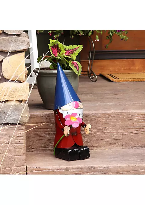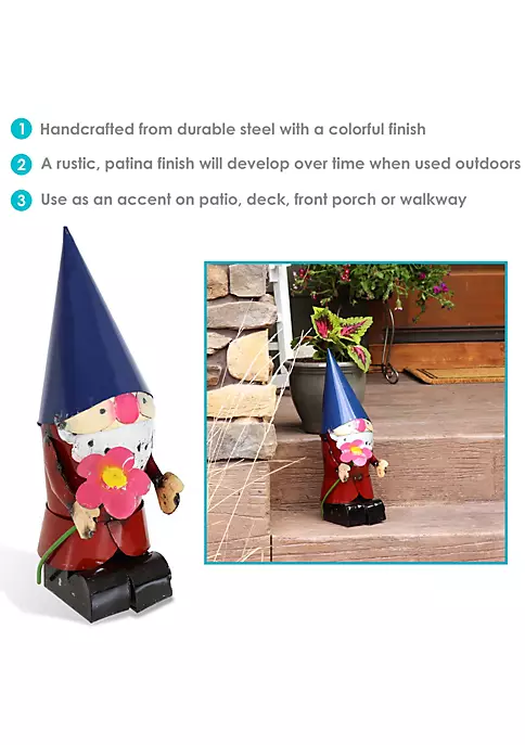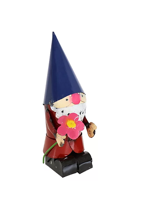 Cheer up the garden, patio, deck, front porch, or other outdoor area with this charming, metal, flower gnome statue. This gnome features a red jacket with a white beard, black boots, a deep blue hat, and a beautiful pink flower offered with his adorable, outstretched hands. The 16-inch gnome features a steel construction for extra strength and durability for long-lasting use with a hand-painted finish. Because it is painted by hand, coloration may vary slightly from piece to piece. This charming fairytale-esque gnome is holding a lovely flower that’s sure to brighten your day and bring a smile to your friends and families faces when they walk past. Use the statue indoors or outdoors to add a unique decorative accent. Due to the handmade rustic nature of the metal sculpture, when used outdoors, this statue will develop a natural patina over time and will show some weathering for an extra rustic look.