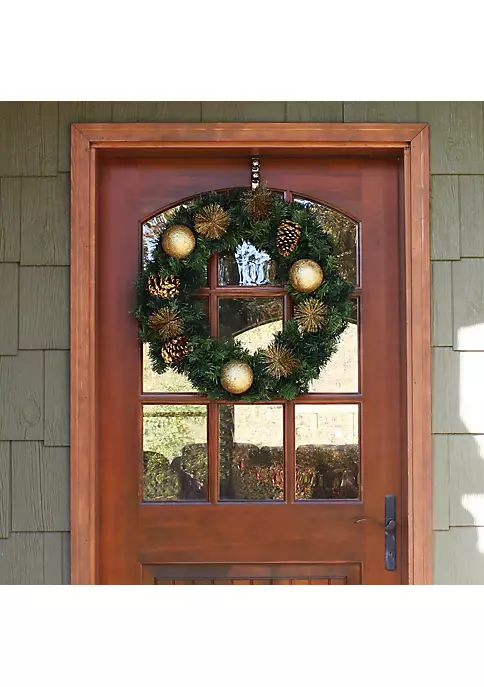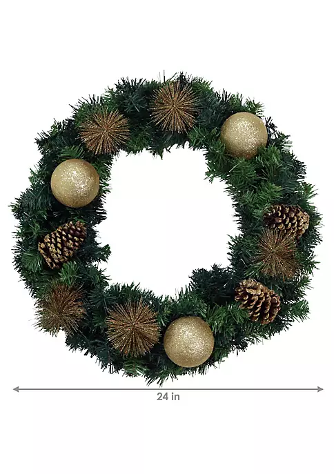 Add some golden glitz to your home this holiday season with this elegant Christmas wreath. Made of durable PVC, this wreath has the appearance of natural pine with realistic pinecones and needles. Plus, this holiday wreath features sparkling poms and golden baubles for festive flair. This stylish winter wreath is perfect for a variety of locations throughout the house including hanging on the front door, above the mantel, on a wall or placed on a shelf.