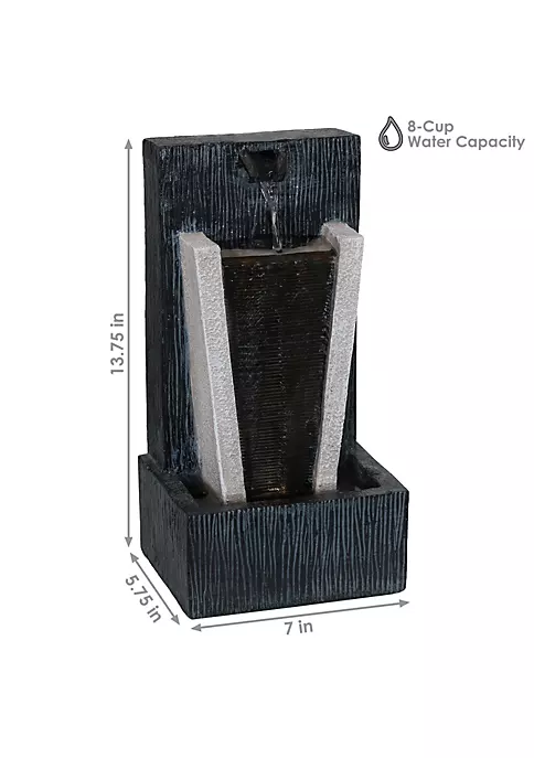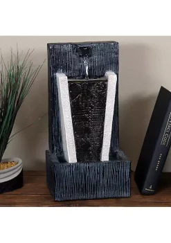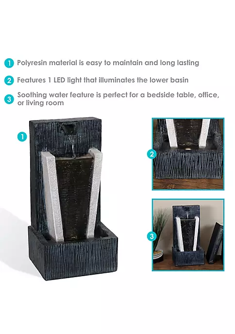 Add a soothing water feature to the bedside table, office, living room or kitchen with this indoor tabletop water fountain. The eye-catching decorative accent features a polyresin construction with an LED light in the basin and a submersible electric pump. Water flows from the top tier of the fountain to the bottom basin where it recirculates through the pump.
