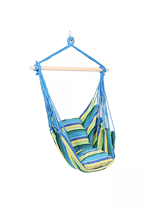 Add a unique seating element to any outdoor space. This hanging hammock chair can be used with our Sunnydaze C-stand. The swing features a durable cotton and polyester canvas construction that makes it perfect for placement outdoors. It also has durable rope attached to sanded hardwood poles to form and keep its shape.