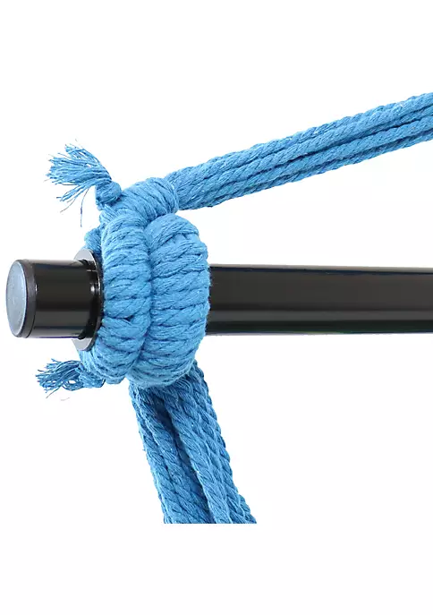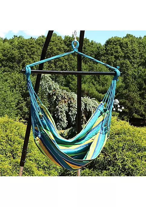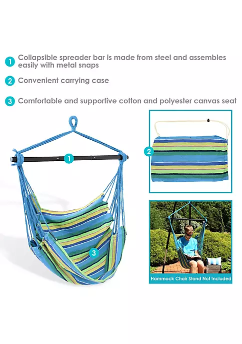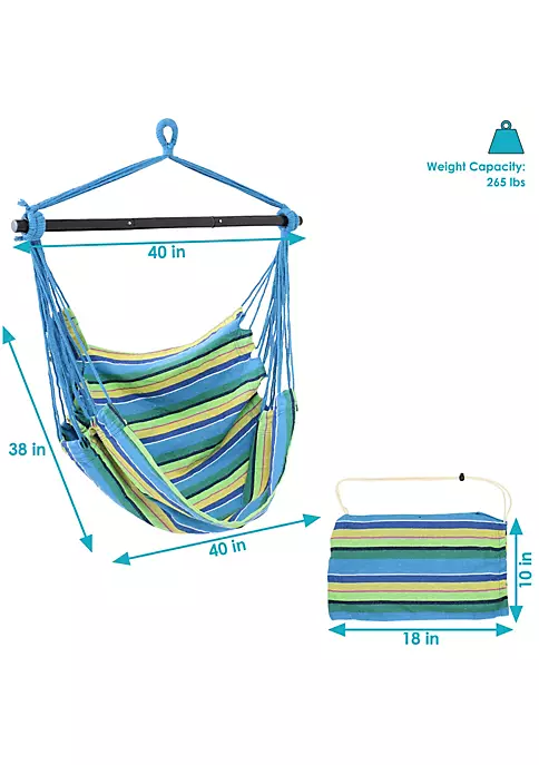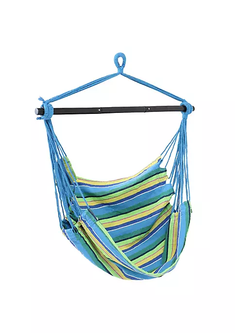 Relax and unwind by resting in this comfortable hanging hammock swing chair on the patio, deck, garden, or other living space featuring blue, green, and tan stripes. The durable cotton and polyester canvas seat provides comfort and support while the material remains resistant to the elements outdoors. Take your hammock swing chair anywhere you’d like easily with the foldable spreader bar and convenient carrying case. The bar folds into three pieces to ensure easy transport and storage so you can enjoy this chair in any park or campsite. Hang this hammock swing chair outdoors to enjoy some relaxation after a long day or hang this hammock chair indoors on any ceiling hook for a fun indoor sitting space. A quick set up allows you to spend time with loved ones outside or enjoy some quiet reading time. No matter where you hang it, this hammock swinging chair allows you to relax comfortably.