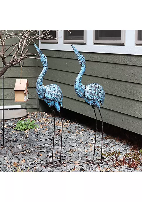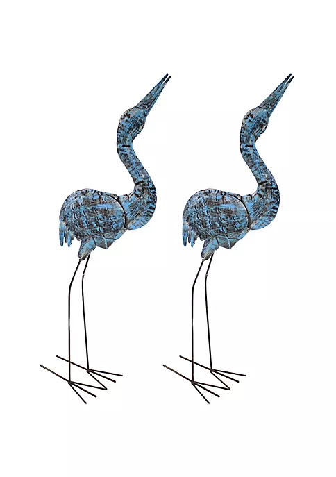 Made from durable metal with a distressed look, this set of 2 metal yard art sculptures can be used either indoors or outdoors. When used outdoors, these heavy-duty sculptures will develop a natural patina over time. This pair of cranes make a whimsical addition inside and outside the home. Due to the handcrafted construction of these sculptures, the design and colors may vary. Whether the cranes are placed in a sunroom or on the patio, they will make a striking addition to any living space.
