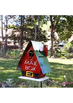 Send off wishes to Santa this holiday season with this unique, metal, Santa belt mailbox birdhouse. With a unique distressed design inspired by Santa’s coat, this adorable rustic birdhouse is made of metal for extra strength and durability against the outdoors and has a vibrant, multicolor finish. For decorative purposes only, this birdhouse can be used in a variety of locations, both indoors and outdoors. This lovely birdhouse also has a variety of mailbox features including two mail slots located on either side of the roof and a back door where you can access them easily. This decorative piece features a beautifully crafted house design with a low, green roof featuring snow on top, a red house-body with a red chimney, and a black belt and golden buckle for extra fun flair. This birdhouse also comes with a hanging chain and hook so you can easily enjoy this feature on any shepherd’s hook or tree branch outdoors, or from any ceiling chain indoors.