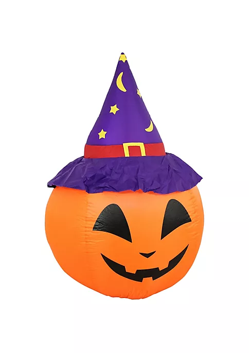 Jack-o’-lanterns are a staple for any indoor or outdoor Halloween decoration scene. Take the fun up a notch with this inflatable jack-o’-lantern shown with a purple witch’s hat featuring stars and moon patterned design and a classic, smiling face, sure to bring a smile to any trick-or-treaters as they pass by! This blow-up yard decor is made from coated polyester material to ensure resistance to the outdoor elements and a fun, adorable piece of decor to last year after year. Included are ropes and stakes to hold the decoration in place, a UL adaptor plugin, LED lights, as well as a fan for inflation, so you can easily set up, take down, and store this inflatable with ease. The included LED light in the body of this pumpkin decor will ensure that the inflatable can be seen spreading Halloween frights all night long. Place this spooky jack-o’-lantern decoration in your kitchen, living room, or yard, and get into the Halloween spirit!