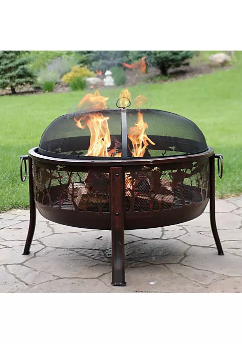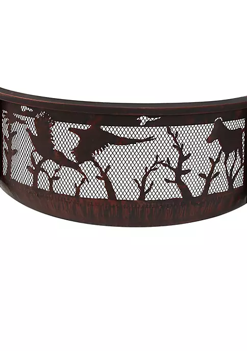 The Sunnydaze Pheasant Hunting Fire Pit makes the perfect centerpiece for a hunting shack, cabin or backyard. The hunting themed fire pit is wood burning and provides enough room building a large, warm fire. Plus, it is easy to tend and clean. The overall fire pit handle to handle is 34″ diameter with a large 30″ diameter bowl that is 11″ deep. It is accented with a decorative pheasant hunting pattern. Each fire pit includes a log poker, spark screen, cover and wood grate. This is a wood burning fire pit and with all fire pits, is not designed to burn on a deck unless a fire proof pad is used. Enjoy this sturdy steel fire pit with the decorative design in the backyard or patio today.