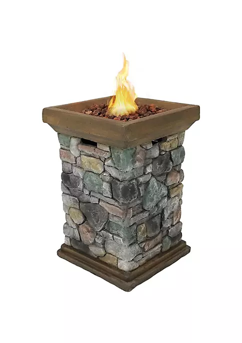- Square column propane gas-powered fire pit with lava rocks|magnesia oxide cast stone construction, stainless steel burner, ignition battery|1 storage cover, lava rock, a 16″ gas hose with regulator|ETL listed|Holds 20-lb propane tank