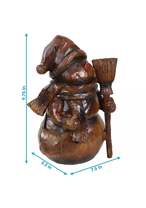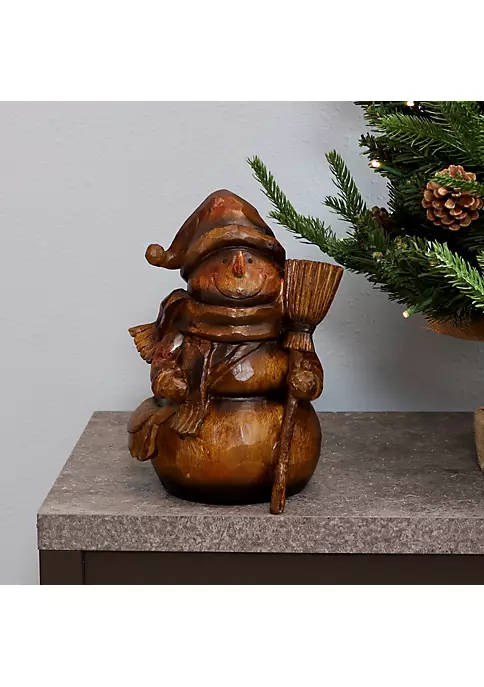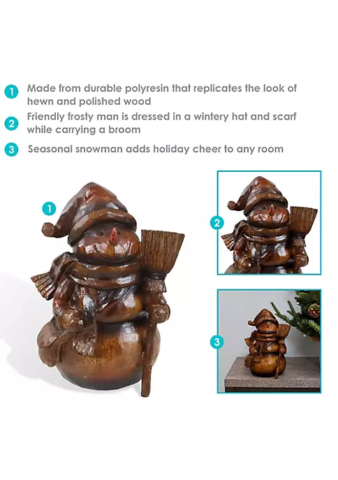 Infuse your home with rustic charm with this indoor snowman tabletop statue. This friendly, frosty man is decked out in a wintery hat and scarf while carrying a broom. This decorative indoor statue is made of a durable blend of polyresin, stone powder and fiberglass that beautifully replicates the look of hewn and polished wood. This seasonal piece of decor will make a great addition to any table, desktop, shelf, countertop and other areas a little holiday cheer is needed inside your home. It does not require assembly, and is ready to be set up right out of the box.