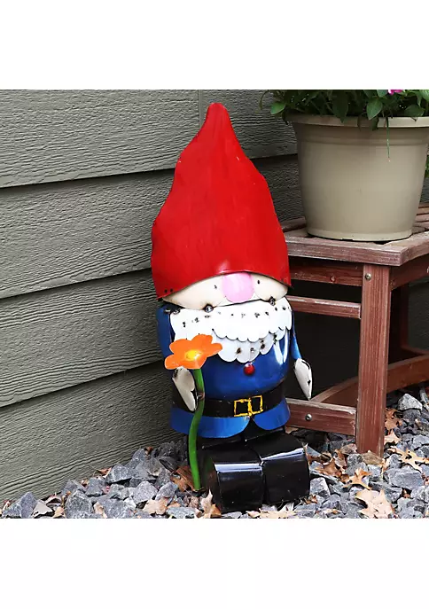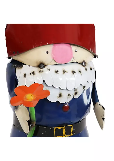 May the luck this beautiful, large garden gnome brings to your patio, lawn, or garden, forever charm your flowers and plants to bloom heartily and fully! This gnome features a blue jacket with a belt around his waist, a white beard, a bright red hat, and a lovely orange flower offered with his adorable, outstretched hands. The 25-inch gnome garden statue features a steel construction for extra strength and durability against the elements, and a hand-painted finish. Due to its hand-painted construction, the coloration may vary slightly from piece to piece. This cheerful, chubby-cheeked gnome is holding a vibrant flower to brighten your day. Use the statue indoors or outdoors to add a unique decorative accent. When this gnome is placed outdoors, this statue will develop a natural patina over time and will show some weathering for an extra rustic look, sure to complement any other metal decor as well.