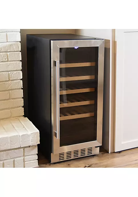 Keep your wine chilled to perfection with this wine fridge by Sunnydaze Decor. The fridge features a modern design and is engineered to last. It can accommodate 33 bottles of wine. Fridge can also hold beer, soda, juice or water. Use the stainless steel bar handle to open the stainless steel encased layered glass door and select a favorite wine by easily sliding one of the 5 beech wood shelves out. A stainless steel grill ventilation and a touchpad controller with LED display finish the clever design. Simply use the touchpad control to set the temperature to the desired option and enjoy evenly chilled wine.