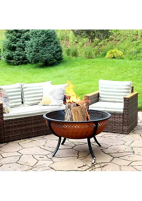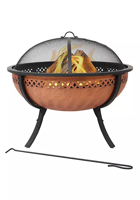 Enjoy the warmth and ambiance of a wood-burning fire on cool evenings with good friends and family with this steel outdoor fire pit. This exterior fire feature has an attractive cross weave cutout along the border of the fire bowl that adds a subtle, yet decorative touch, and adds convenient air flow to the fire. It is durably constructed of steel with a beautiful copper finish to brighten your outdoor space while staying resistant to the outdoor elements. This fire pit includes everything needed to build and maintain a well-burning fire, including 1 fire pit, 1 spark screen, 1 fire poker and 1 log grate. Use the poker to easily maneuver wood and keep the fire burning all night long or use it to lift up the spark screen when it’s hot. The spark screen will keep your loved ones safe from flying embers. Use the log grate to easily store wood.