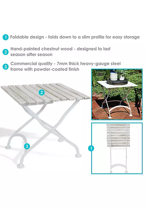 Capture the charm of a Parisian bistro with the elegant European Chestnut Wood Folding Square Side Table by Sunnydaze Decor. This versatile square table can be used in a number of places both indoors or outdoors. It’s the perfect addition for your patio, balcony or living room. This beautiful small folding table features a sophisticated chestnut wood tabletop for a classic look and natural resistance to the outdoor elements as well as a 7 mm thick powder-coated steel frame for long-lasting durability. Plus, this side table easily folds up for convenient storage and portability. Pack it up and take it on your next camping trip, or fold it up and tuck it in your closet when you’re done using it.