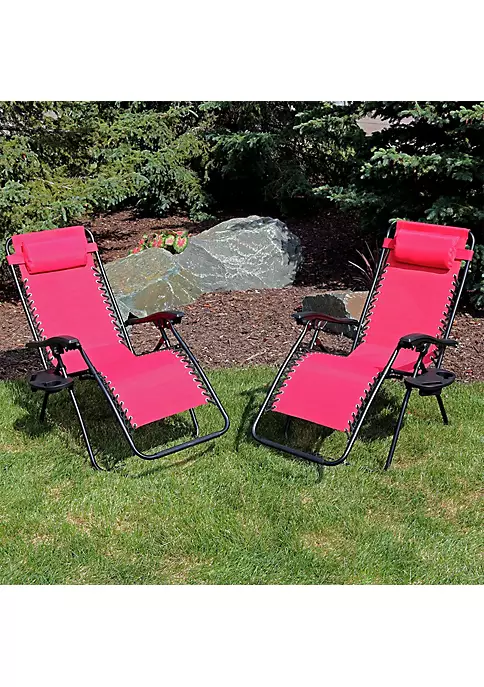 These new zero gravity chairs (set of 2) are the perfect recliner patio loungers. The Sunnydaze Zero Gravity Chairs include a pillow and cup holder to offer the ultimate experience in portable patio furniture. Designed with comfort in mind, these chairs are made from all-weather fade-resistant synthetic fabric sling fabric. The bungee cords that connect the synthetic fabric seat to the sturdy steel frame help to enhance the comfort and function of the chair. The headrest pillow has an elastic band that makes it easy to place the pillow where it works best. The smooth recline function easily locks into any desired position by flipping the knobs on both sides away from the user to lock the reclined position in place.