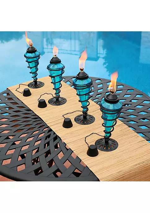 - ENJOY TABLETOP LIGHTING AT NIGHT: 4.25 inches diameter x 11.5 inches tall; Set weighs 6.8 pounds (1.8 lbs per torch); Holds approximately 8 oz (1 cup) fuel