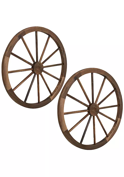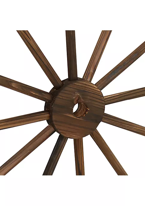 - ADDS COUNTRY CHARM: 29.5 inches diameter x 1.5 inches deep; Weighs 4.5 pounds; Spokes are 10.75 inches long; Center hole is 1.25 inches diameter; Central hub is 4.5 inches diameter; Has the appearance of an antique wagon wheel from a barn or farm; Perfect for adding a touch of decoration to the backyard